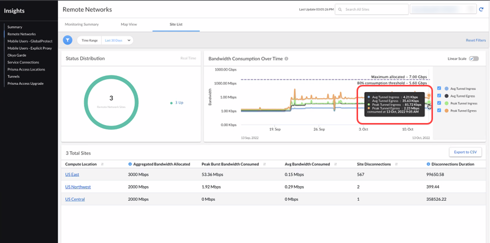 You can view the ingress, egress, average, and peak bandwidth consumption over time using the tunnel_status resource.