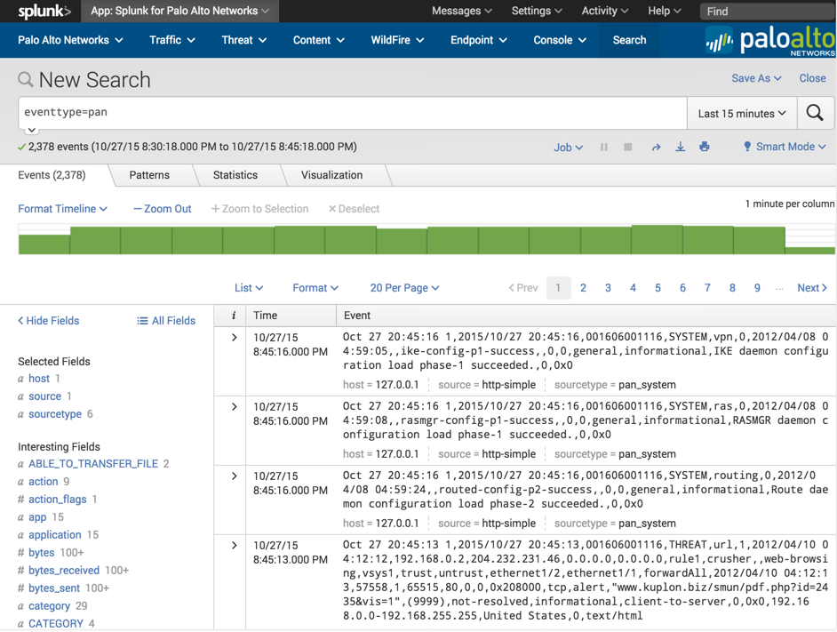 Use the method described in the Test the configuration section to produce some syslogs. Verify the logs are reaching the Splunk server by navigating to the Splunk for Palo Alto Networks app, click 'Search' in the navigation bar, then enter: